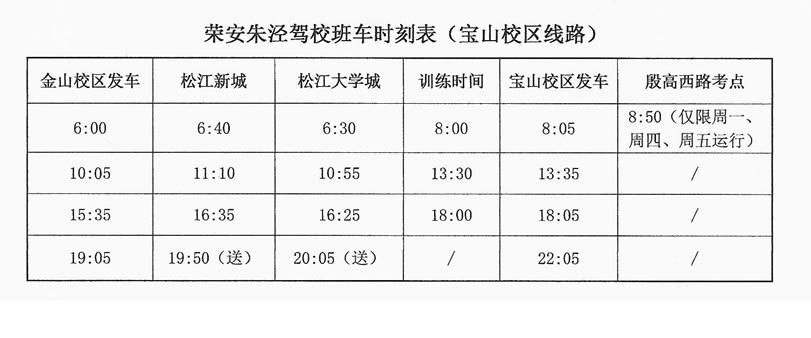 为方便学员,驾校提供免费班车接送学员,学员如需乘坐班车请提前5-10分钟到达指定班车点,目前荣安驾校金山校区班车线路有:莘庄、松江新城、松江大学城(体育中心)、石化、朱泾镇等。